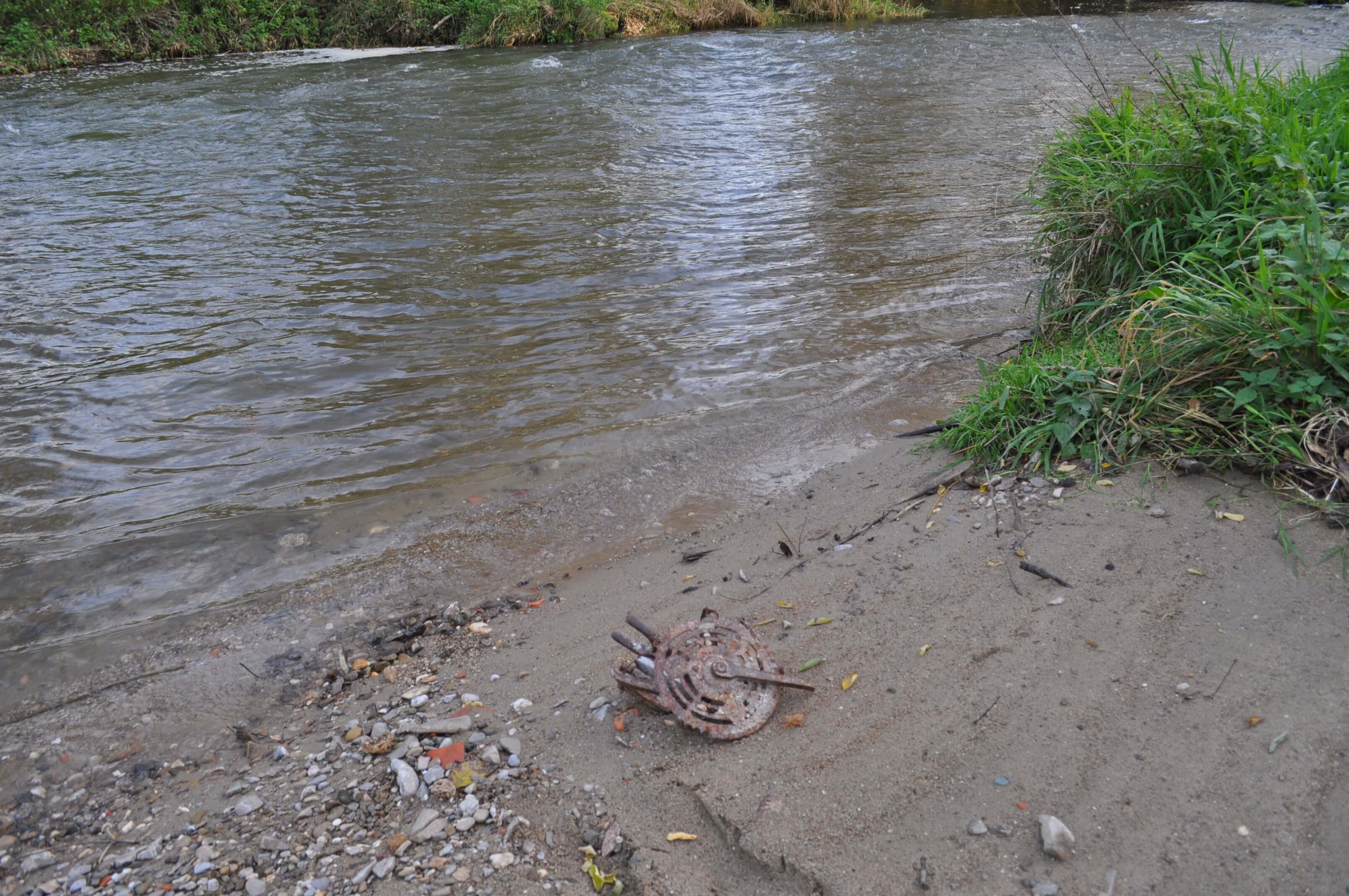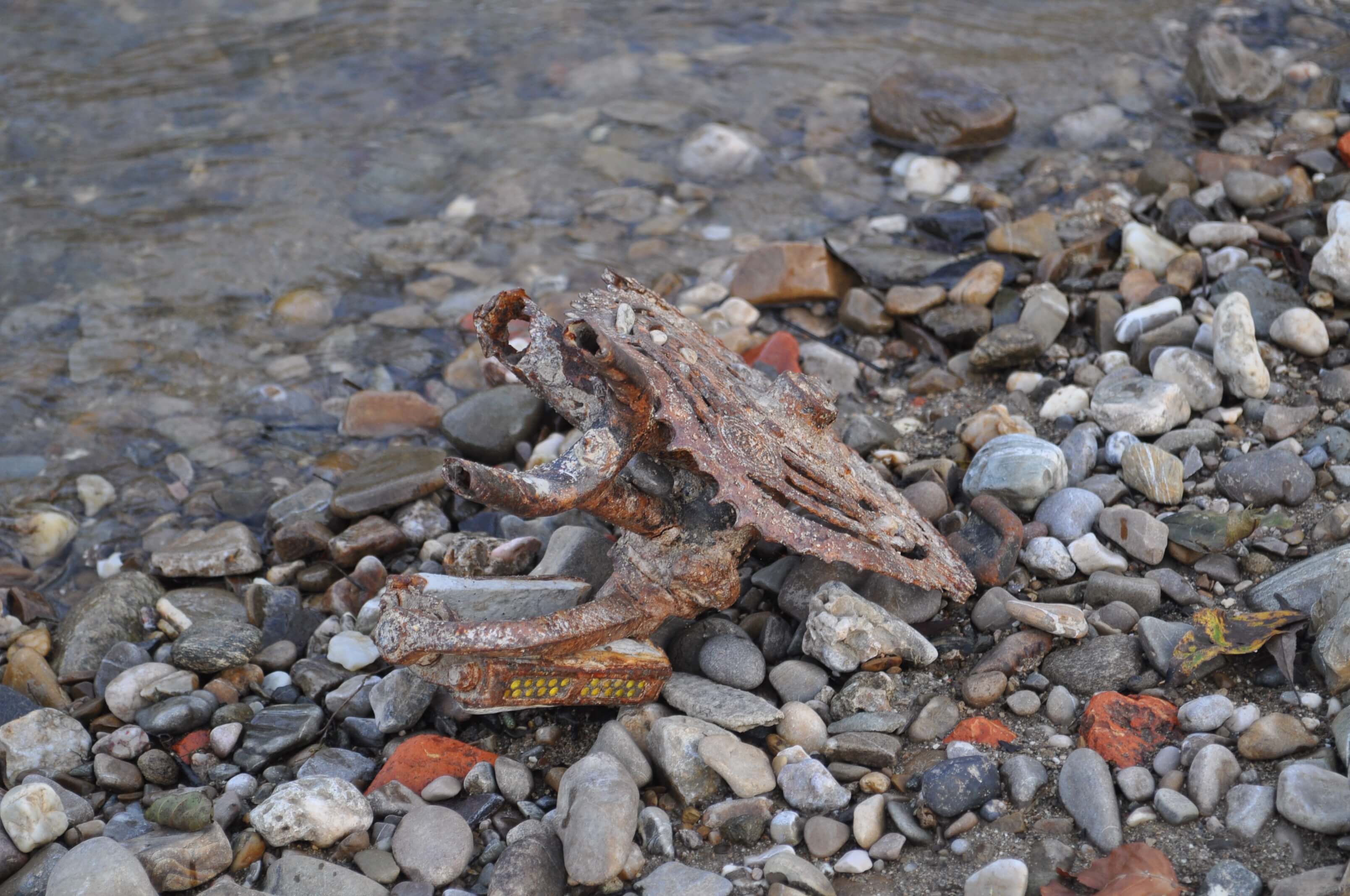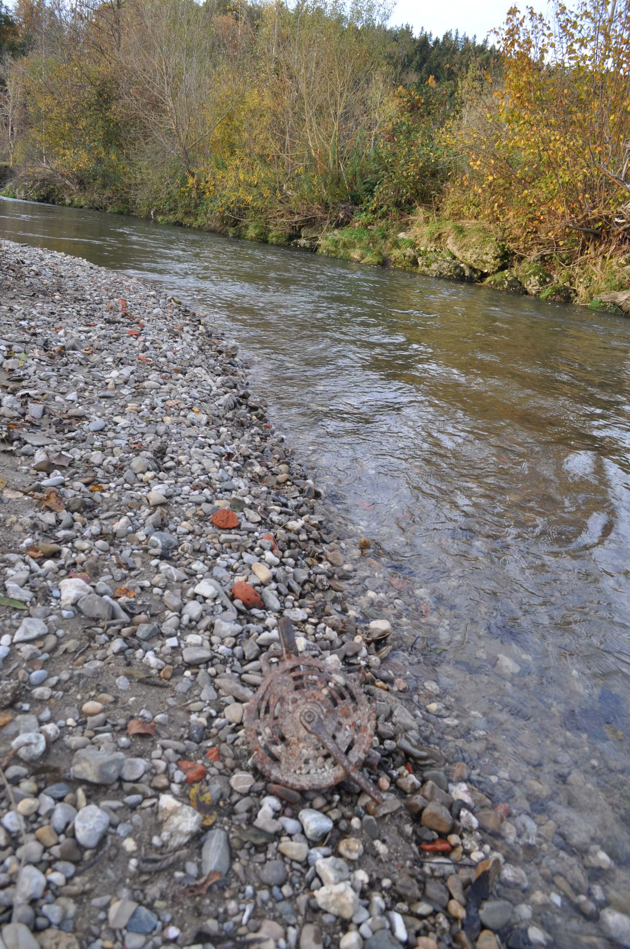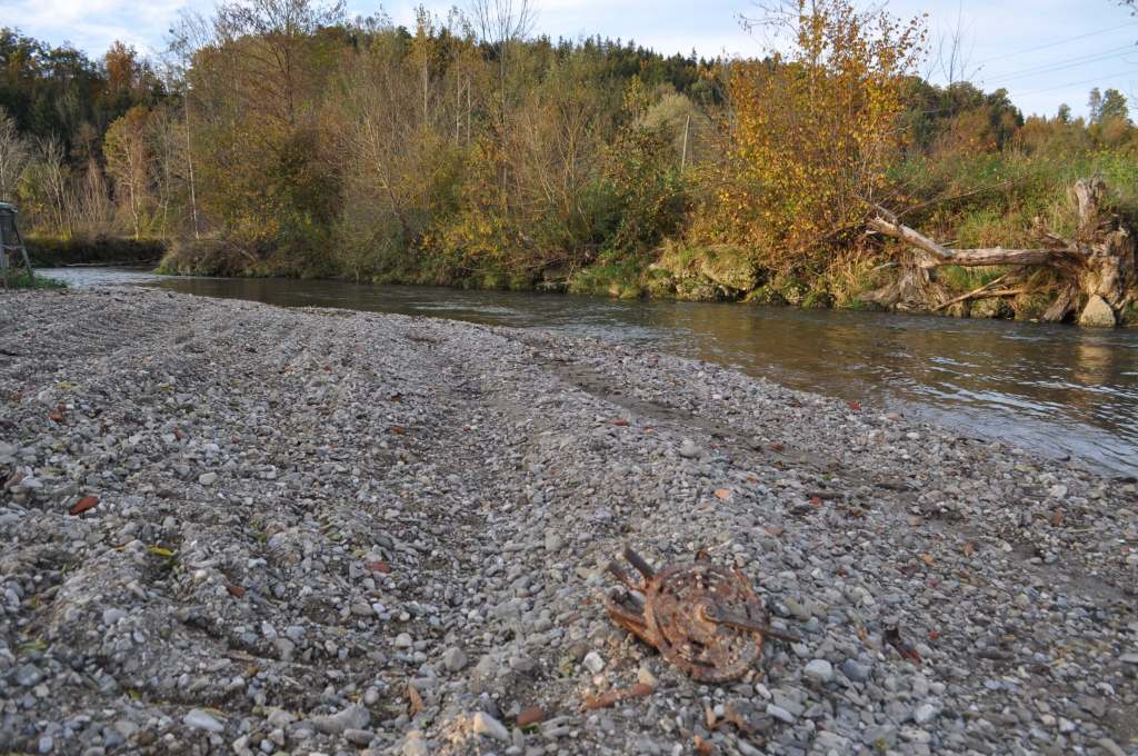 Als ich mein Auge so schweifen ließ, stach mir ein im Wasser befindlicher Schatz in selbiges. Im seichten Uferwasser fiel das Sonnenlicht auf ein Stück eines alten Fahrrades – genauer gesagt ein Tretlager samt Kurbel mit abgerosteten Rahmenstücken. Im Takt des fließenden Wassers flüsterte es: „Rette mich – hol mich hier raus!“ Das ließ ich mir nicht zweimal sagen und zog das Teil, unbeachtet der nassen Schuhe, die ich mir dabei ebenfalls holte, ans Ufer.
