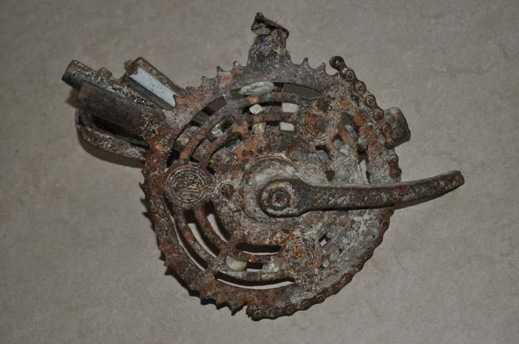 Bei genauerer Betrachtung erkannte ich ein Steyr Kettenrad älteren Datums, mit einem Stück der darauf angerosteten Kette. Die Kurbel war vom Wasserdruck im Lauf der Jahre stark verbogen und auch der andere kümmerliche Rest zeugte von einem langen Aufenthalt im Fluss.