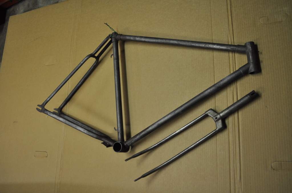 Nach dem Zerlegen bis zur letzten Schraube übergab ich den Rahmen einem Fachbetrieb zum Entlacken. Der Zwischenzustand sah dann so aus: