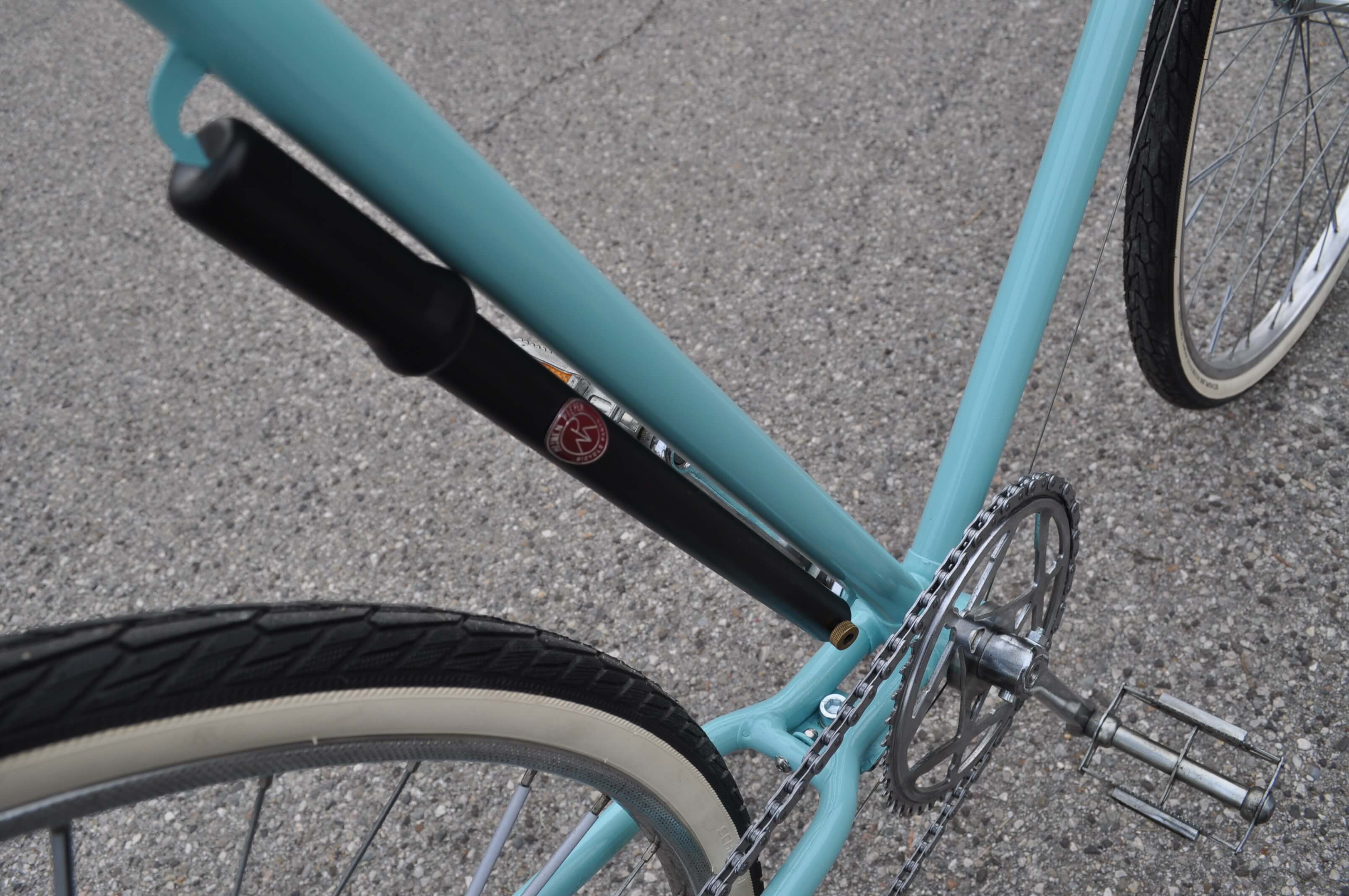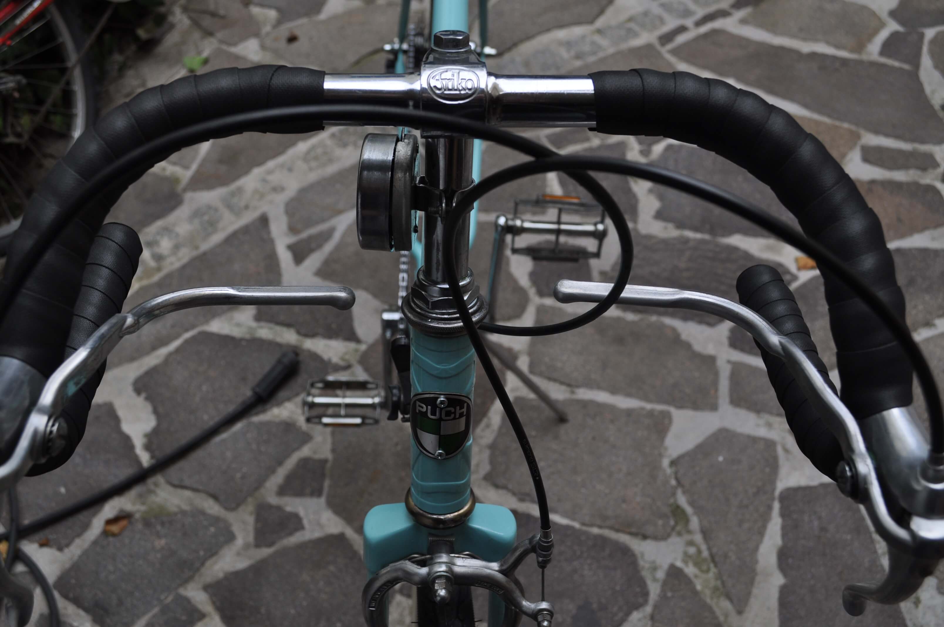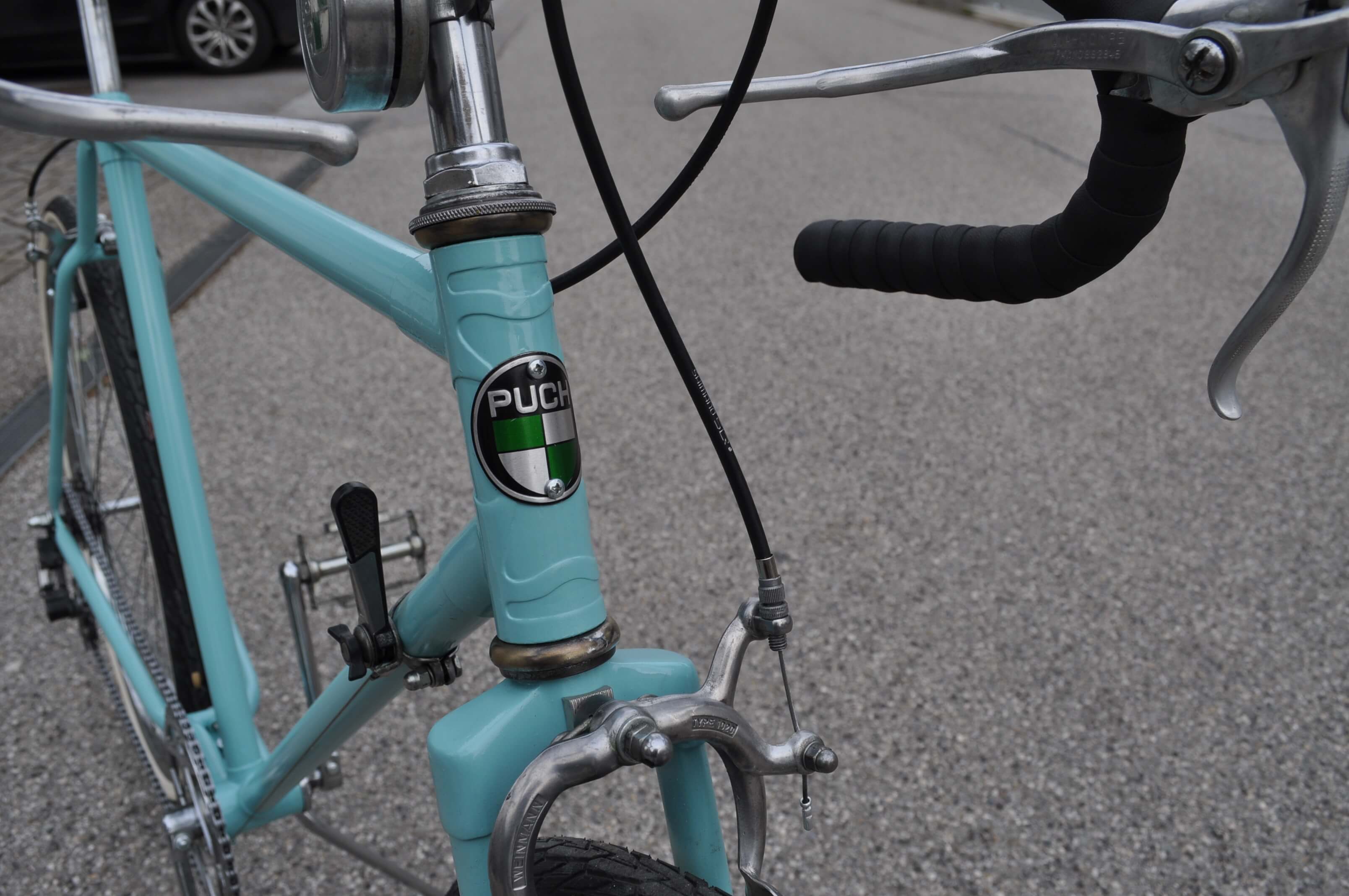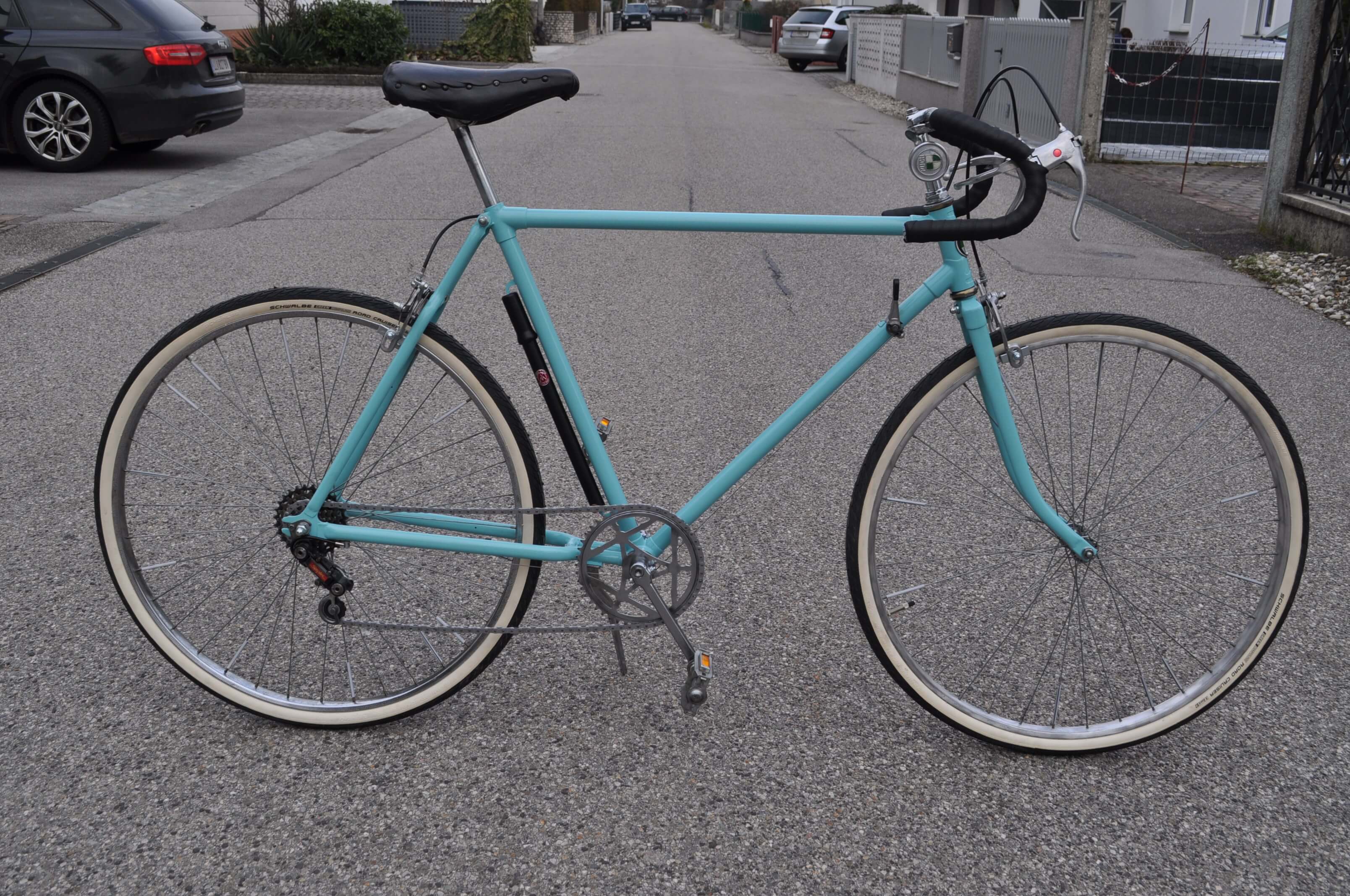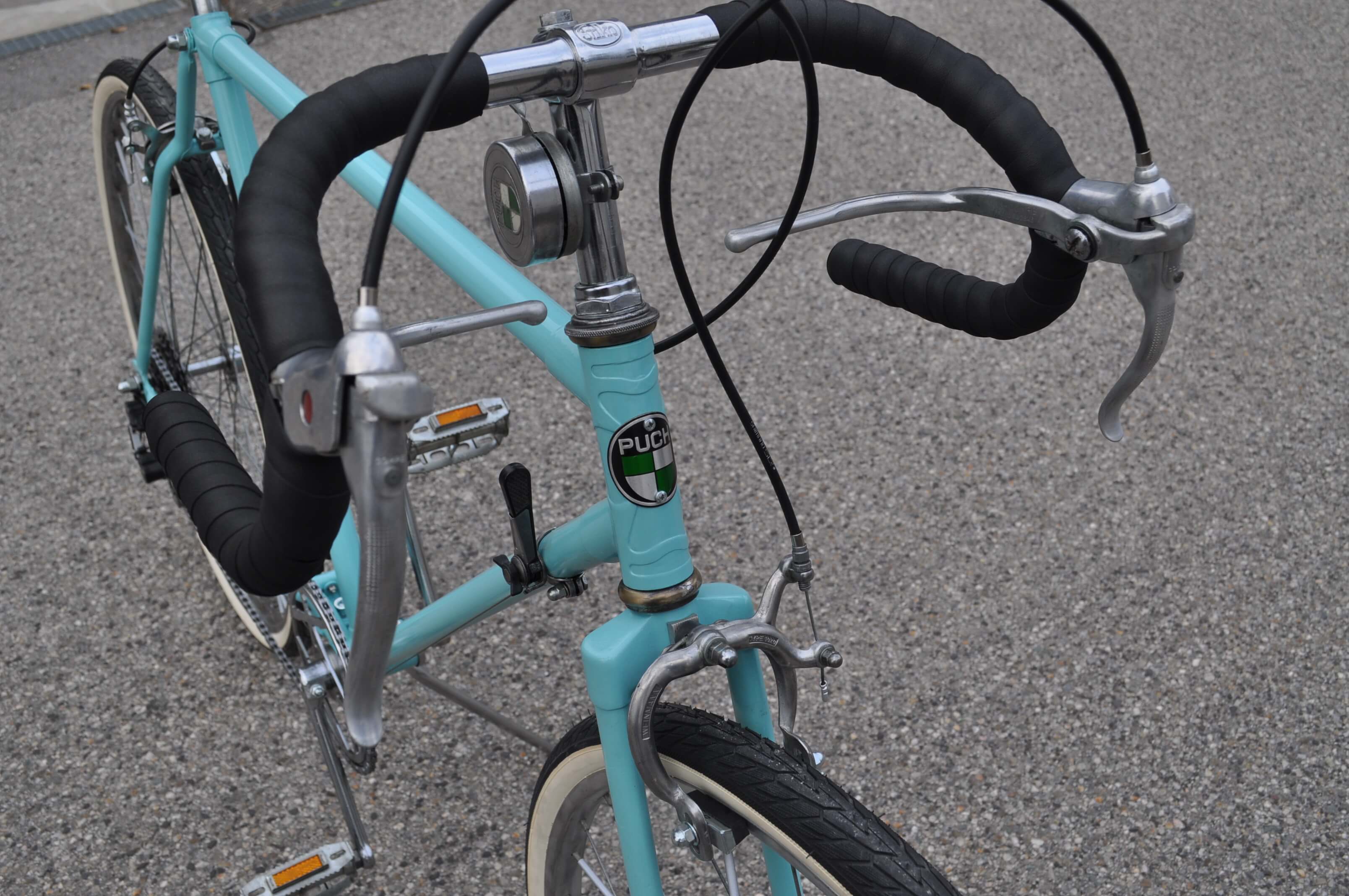 Passend zur bereits von Rainer angebrachten Puch-Glocke habe ich das Rad auch mit einem Puch-Steuerkopfschild versehen. Der vielleicht etwas klobig anmutende Sattel ist ebenfalls eine Kreation von Rainer und eine Reminiszenz an den Schuster-Beruf seines Großvaters. Das Leder, das mit Ziernägeln an einem Kunststoffsattel angebracht wurde, erhielt durch mich eine fachmännische Zuwendung in Form von Lederöl.