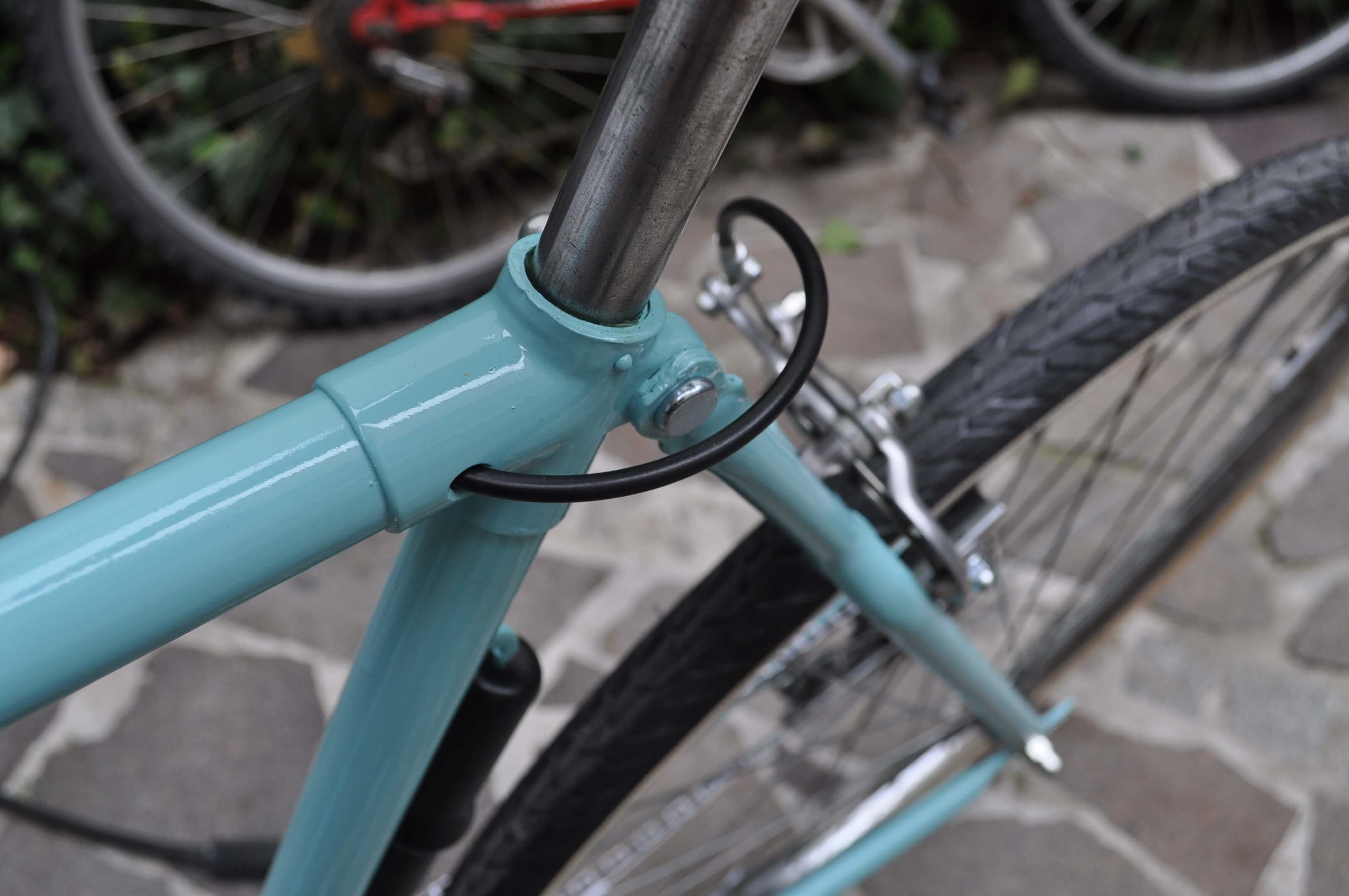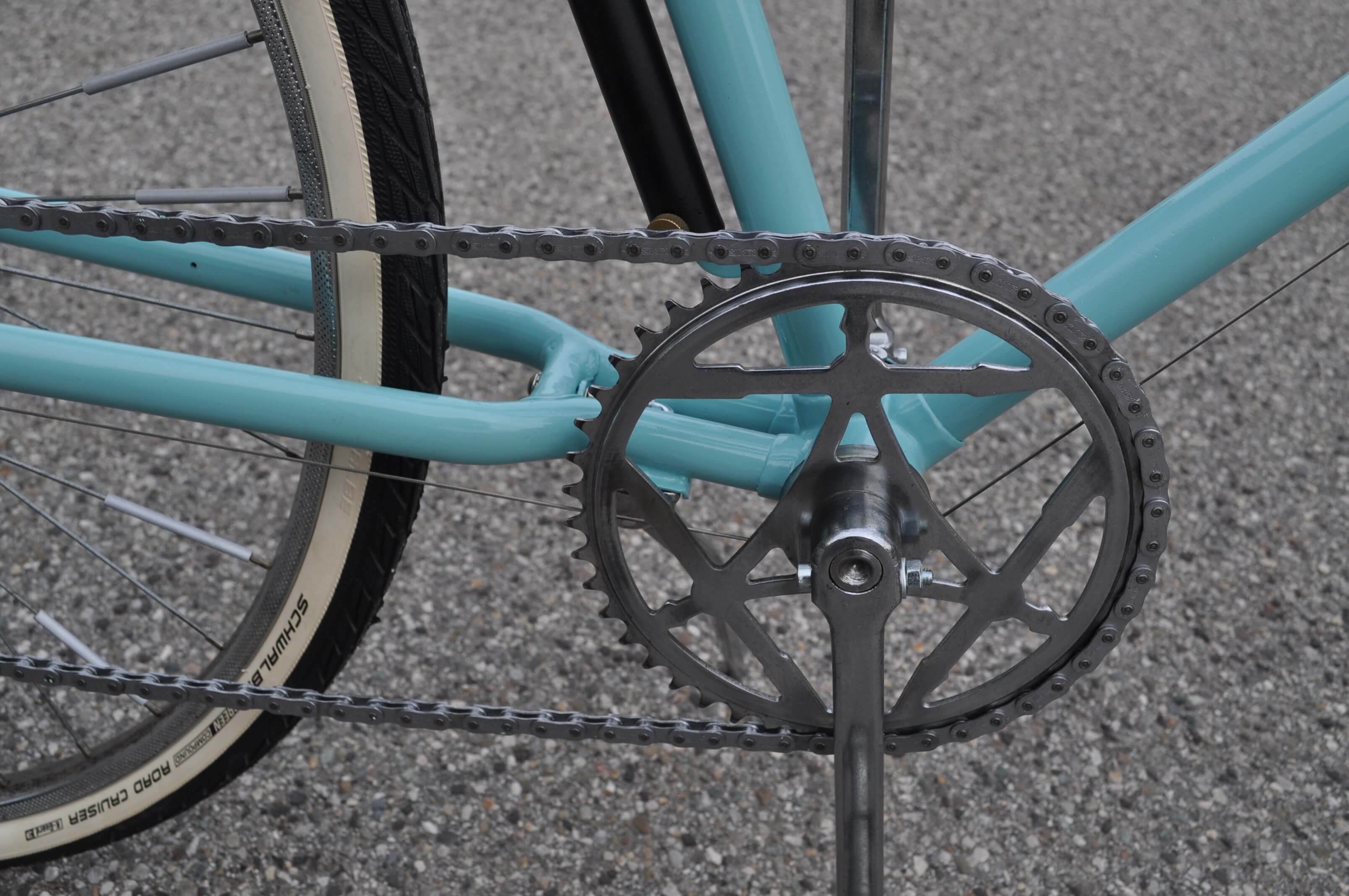 Um Rainers Rad wieder in fahrbereiten Zustand zu versetzen, habe ich alle Lager zerlegt und gereinigt sowie alle relevanten Verschleißteile erneuert. Außerdem habe ich auch folgende Verbesserungen vorgenommen: Einlöten einer Ständergrundplatte, Anbringen eines Widerlagers für die Schalthebelschelle am Unterrohr, Montage der Schaltseilführung unter dem Tretlagergehäuse sowie Verlegung des Bremszuges ins Oberrohr.